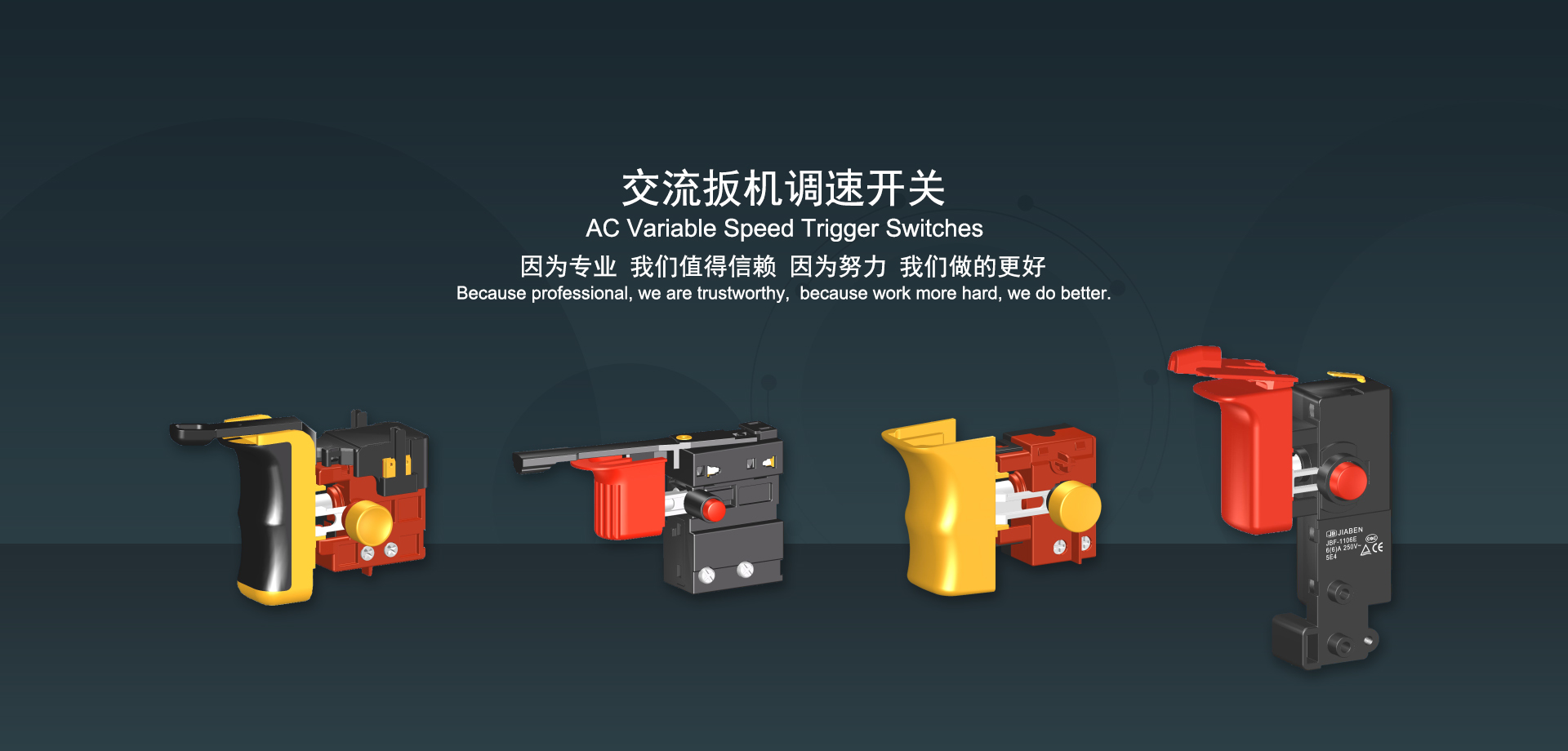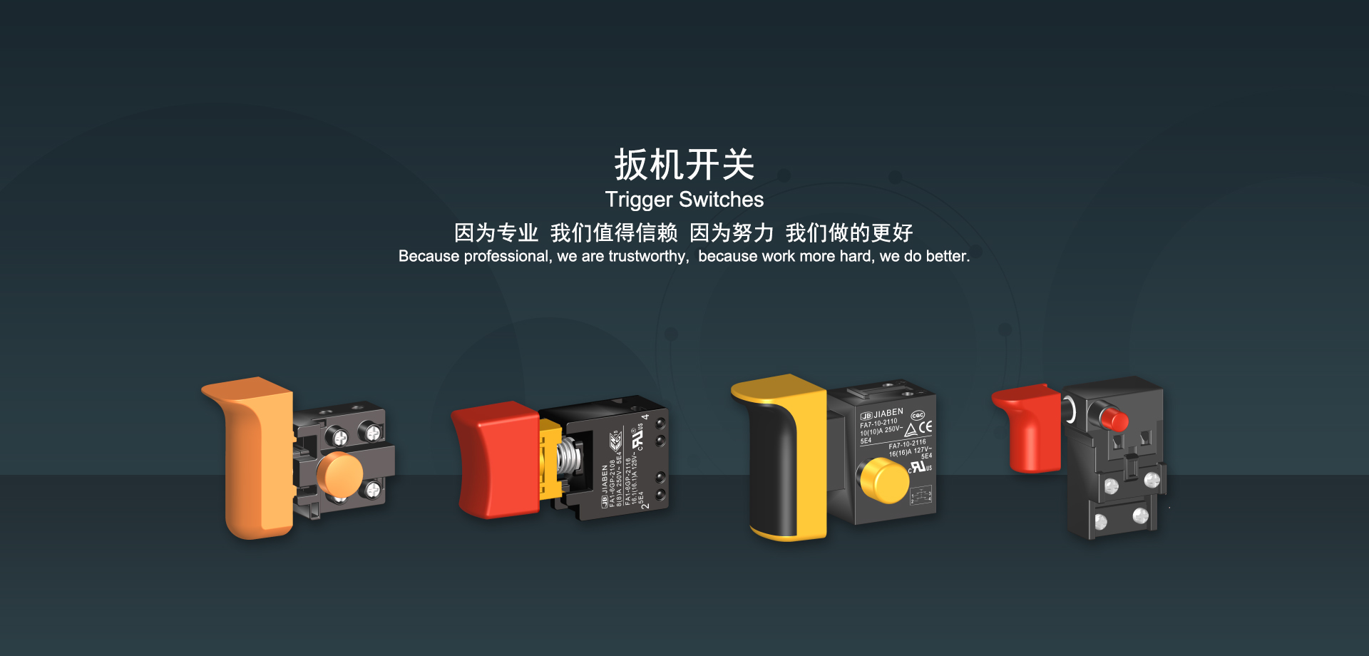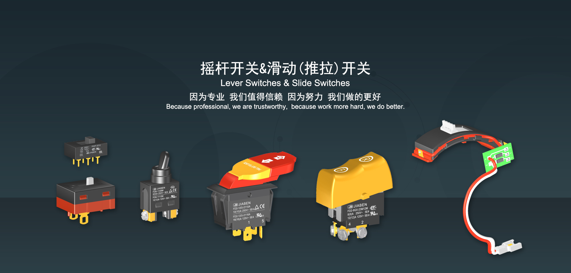 浙江佳奔電子有限公司始建于1986年,坐落于浙江省樂清市虹橋鎮(zhèn)東電子信息產(chǎn)業(yè)園內(nèi),現(xiàn)有職工700多人,資產(chǎn)總額超3億元。公司主要經(jīng)營“JIABEN”牌微動開關(guān)、蹺板開關(guān)、按鈕開關(guān)、扳機開關(guān)、調(diào)速開關(guān)和電位器開關(guān)等各類交、直流器具開關(guān)和各類交、直流線路板模塊等產(chǎn)品,主要應用于交、直流電動工具、電動園林工具、清潔器具、家用電器和小型機床等行業(yè),是集產(chǎn)品設計、研發(fā)、制造、銷售和服務于一體的國家高新技術(shù)企業(yè)。JIABEN was founded in 1986, located in East Electronic Information Industry Park, Hongqiao Town, Yueqing City, Zhejiang Proviance, existing staff more than 700 peoples, more than 300 million RMB worth of assets. Company is mainly engaged in "JIABEN" brand Micro Switch, Rocker Switch, Push-button Switch, Trigger Switch, Speed Regulating Switch, Potentiometer Switch and other kinds of appliance switch and all kinds of AC or DC circuit board module, such as more than 100 series, 8000 kinds of models of products, mainly used in AC or DC Power-tools, Power Gardening Tools, Cleaning Appliances, Household Appliances and Small Machine Tool and other industries, is the collection product design, research and development, manufacturing, sales and service in one of the national high and new technology enterprise.
