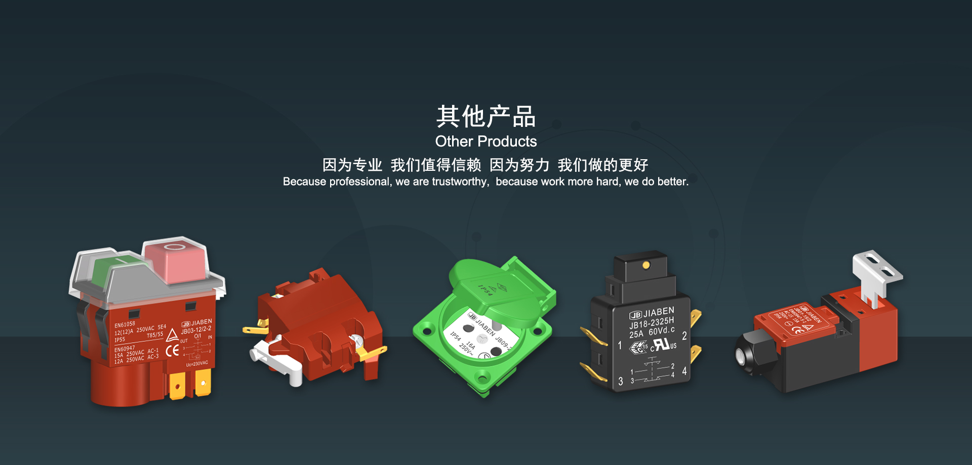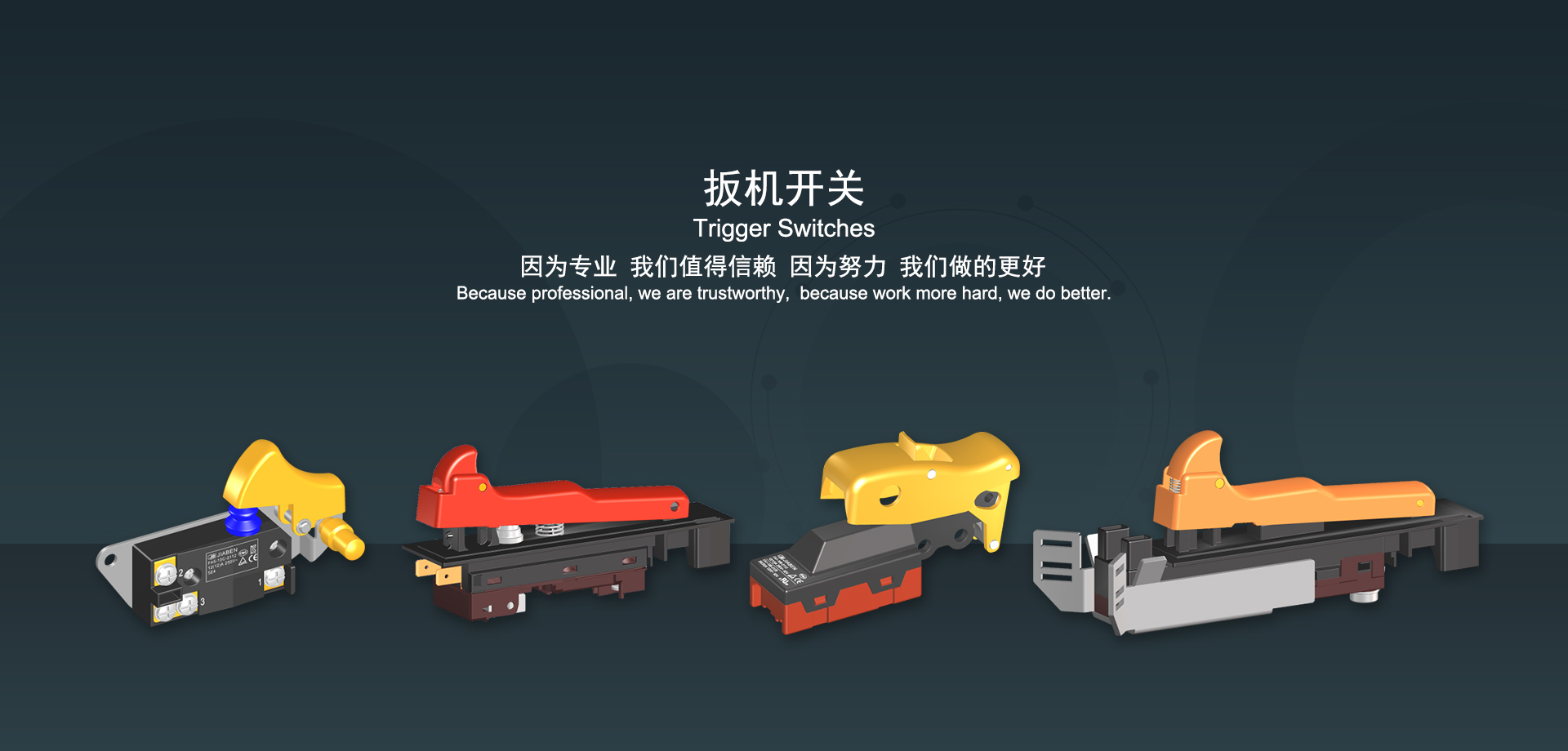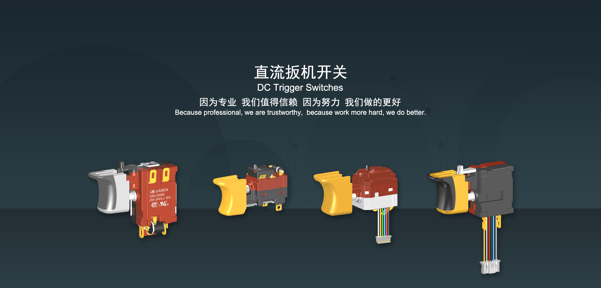 浙江佳奔電子有限公司始建于1986年,坐落于浙江省樂清市虹橋鎮(zhèn)東電子信息產(chǎn)業(yè)園內(nèi),現(xiàn)有職工700多人,資產(chǎn)總額超3億元。公司主要經(jīng)營“JIABEN”牌微動開關(guān)、蹺板開關(guān)、按鈕開關(guān)、扳機開關(guān)、調(diào)速開關(guān)和電位器開關(guān)等各類交、直流器具開關(guān)和各類交、直流線路板模塊等產(chǎn)品,主要應用于交、直流電動工具、電動園林工具、清潔器具、家用電器和小型機床等行業(yè),是集產(chǎn)品設計、研發(fā)、制造、銷售和服務于一體的國家高新技術(shù)企業(yè)。JIABEN was founded in 1986, located in East Electronic Information Industry Park, Hongqiao Town, Yueqing City, Zhejiang Proviance, existing staff more than 700 peoples, more than 300 million RMB worth of assets. Company is mainly engaged in "JIABEN" brand Micro Switch, Rocker Switch, Push-button Switch, Trigger Switch, Speed Regulating Switch, Potentiometer Switch and other kinds of appliance switch and all kinds of AC or DC circuit board module, such as more than 100 series, 8000 kinds of models of products, mainly used in AC or DC Power-tools, Power Gardening Tools, Cleaning Appliances, Household Appliances and Small Machine Tool and other industries, is the collection product design, research and development, manufacturing, sales and service in one of the national high and new technology enterprise.